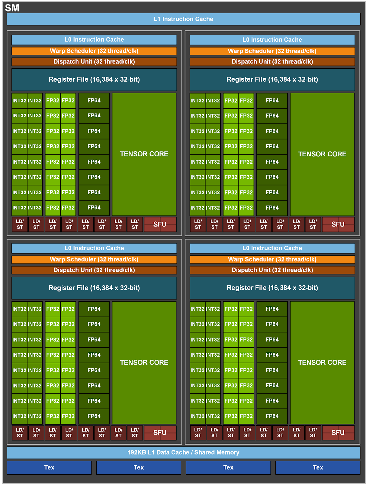 计算能力 8.x 的 GPU 设备采用 Ampere 架构,下图展示了该架构下的流多处理器(SM)的结构示意图(以 Tesla GA100 为例)。