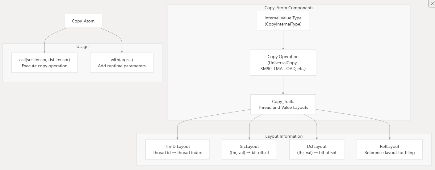 Copy_Atom 封装基本的拷贝指令,所以叫 Atom,即针对 SRC-DST 的一次搬运。适配不同的硬件指令集,比如通用拷贝/向量化 UniversalCopy<…>,cp.async(Ampere架构)。