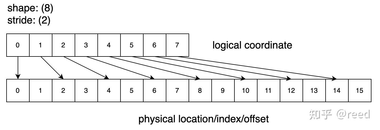 如上图 layout (8):(2),按照映射公式得到 index_phy = index_logic * 2,将连续以一维索引 0,1,2,…7 映射到内存地址 0,2,4,…14。此时: