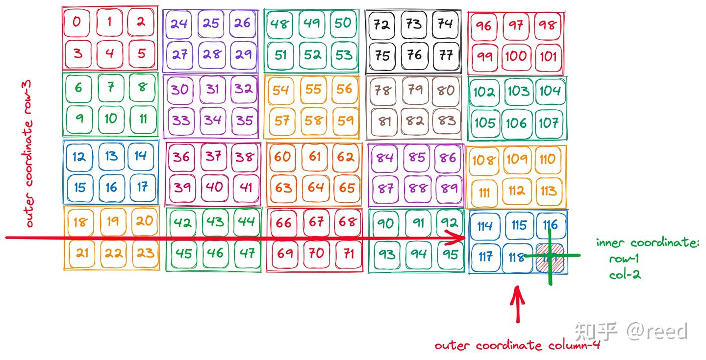 对一个 layout 为 ((2, 4), (3, 5)):((3, 6), (1, 24)) 的 tensor 进行数据访问时,其访问格式遵从上述的顺序,形式为:
