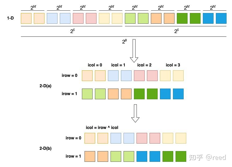 引用reed解释及图示,其输入为一个一维坐标的 layout,通过 swizzle 将其拆分为二维坐标表示形式: