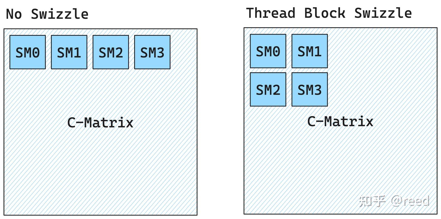 由于 CUDA 调度实际上是以 block id 的顺序进行调度的,有时候,通过对 thread block 映射的 tile 进行重新排序,最大限度的利用 L2 cache 中个的数据,提升性能。